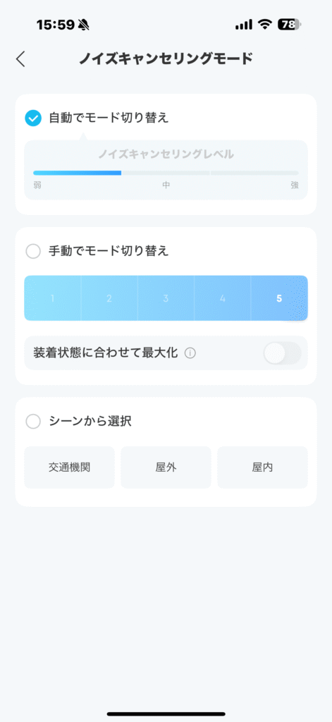Anker独自技術の「ウルトラノイズキャンセリング2.0」搭載され、「自動でモード切り替え」では外部環境に合わせてANCの強度が自動で調整されます。