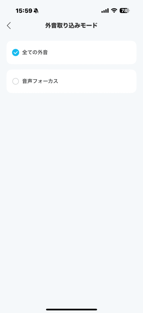 外音取り込みモードに関しては「すべての外音」「音声フォーカス」2つのモードがあります。